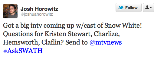 Такую уникальную возможность предлагает известный MTV-деятель Джош Хоровиц на своей Twitter-страничке: "Скоро будет большое интервью с актерами Белоснежки! Вопросы для Кристен Стюарт, Шарлиз, Хемсворта, Клафлина? Отправляйте на @mtvnews#AskSWATH" И даже если Вы не владеете английским языком, но Вам очень хочется что-нибудь узнать у актеров либо о фильме, сайт male4ka.moy.su поможет Вам в этом - для этого Ваш вопрос разместите в комментарии к этой новости, мы ее переведем и запостим на @mtvnews#AskSWATH! Как только будет получен ответ, мы разместим его на ленте!
