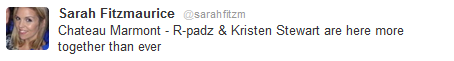 "Они пришли вместе и изредка отходили друг от друга", работник на вечеринке сказал нам. "Это было мило, они смешались с гостями, но каждый постоянно следил, где находится его половинка. Не было недостатка в выявлении чувств на людях! Они держались за руки весь вечер". После прибытия они на короткое время разошлись, чтобы пообщаться с друзьями и гостями, а также с коллегой по "Расвету" - Тэйлором Лотнером! Видимо Роб пил шампанское, пока Кристен общалась с несколькими друзьями". ![]() "Роберт Паттинсон потягивал шампанское, одетый в футболку и бейсбольную кепку. Оскар, я люблю тебя." ![]() "Наша любимая парочка здесь и они милы, смотрят друг на друга и не боятся выявлять свои чувства на глазах у всех" Как заявляют очевидцы, после вечеринки парочка не отправилась домой, а посетила ресторан "Chateau Marmont". @CLAUDI CIUFFO: Умру прямо сейчас, обедаю в Chateau Marmont, глядя на Кристен Стюарт и Роберта Паттинсона. @CLAUDI CIUFFO: Меня убивает то, что я рядом Кристен Стюарт и Роберт Паттинсон и я не могу сделать снимок. Раздражает, но это правила Chateau . @CLAUDI CIUFFO: Мой официант также обслуживает и столик сумеречных Роберта и Кристен в Chateau. Я сказала ему, что я фанат этого фильма. @CLAUDI CIUFFO: Красивые Кристен Стюарт и Роберт Паттинсон обедают прямо сейчас с парой друзей в Chateau Marmont. @CLAUDI CIUFFO: Кристен только что попрощался с другом и села рядом с Робом. Они говорят оживленно, он пьет пиво, у нее кола. @CLAUDI CIUFFO: Пара Роб и Кристен из Сумереки только что вышла из Chateau. ![]() "Мы тусили с Линсей Лохан на вечеринке Terry Richardson и только что встретили влюбленных РПаттза и КСтю в Chateau" ![]() "РПаттз и Кристен Стюарт выглядят супер-супер влюбленными в Chateau Marmont. Как и его короткие волосы. Оба постоянно курят в углу." ![]() "Chateau Marmont - РПаттз и Кристен Стюарт здесь и выглядят очень даже вместе" ![]() "Роберт со стаканом и курит, они отправились на бар, держась за руки и выглядят очень мило, и очень вместе" При полном или частичном копировании материалов сайта, активная ссылка на него (сайт) обязательна!