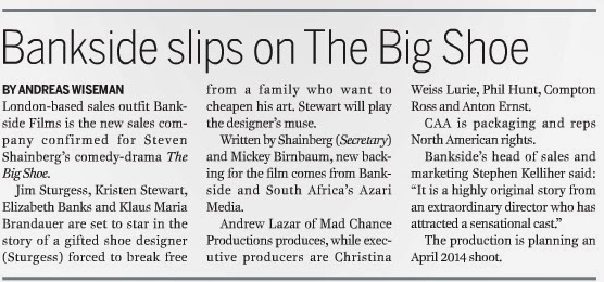 Режиссер: Стивен Шейнберг Актеры: Джим Стерджесс, Кристен Стюарт, Элизабет Бэнкс, Клаус Мария Брандауэр От режиссера обласканного критиками и имевшего большой кассовый успех фильма "Секретарша" (2001). "The Big Shoe" ("Большой башмак") - дерзкая комедийная мелодрама о необычном дизайнере обуви Нейте, находящемся в творческом кризисе, и его вновь обретенной музе Дэлфи, которая вдохновляет его на возобновление его блестящей дизайнерской работы. Не получив одобрения своей семьи на создание высококлассной женской обуви, Нейт Арбингер отказался иметь что-либо общее с фамильным бизнесом по производству обуви, пока жив его отец. После его смерти Нейт возвращается домой на его похороны, где узнает, что его мать Ирэн и старшая сестра Эллен отчаянно хотят, чтобы он дал новую жизнь их компании, однако Нейт не выказывает к этому никакого интереса. Видя, что Нейт не идет на контакт, Ирэн, стремясь вернуть Нейта к работе, решает нанять доктора (Элизабет Бэнкс), который специализируется на лечении такого заболевания, когда для человека нога является объектом обожания и преклонения. Доктор в свою очередь нанимает Дэлфи (Кристен Стюарт) в качестве музы Нейта – модель, специализирующуюся на демонстрации ног, и работающую в секс-индустрии. Вдохновленный красотой Дэлфи, Нейт в нее тут же влюбляется и начинает создавать свои самые красивые работы. Когда же семья получает контроль над его новой линией обуви и разлучает его с его музой, Нейт снова чувствует себя разбитым, до тех пор, пока не вмешивается доктор для восстановления неожиданной и удивительной гармонии в его жизни. ![]() ScreenDaily: Лондонская компания Bankside Films, занимающаяся продажей фильмов на кинорынках, стала официальным дистрибьютором комедийной мелодрамы Стивена Шейнберга "The Big Shoe" ("Большой башмак") на международном рынке. Джим Стерджесс, Кристен Стюарт, Элизабет Бэнкс и Клаус Мария Брандауэр воплотят на экране историю об одаренном дизайнере обуви (Стерджесс), который вынужден порвать со своей семьей из-за того, что они низводят его искусство до массового сектора ради получения коммерческой прибыли. Стюарт сыграет его музу. Сценарий написан Шейнбергом и Майклом Бернбаумом. Финансированием их детища будут заниматься компании Bankside и South Africa’s Azari MediA. Съемки запланированы на апрель 2014 года. Продюсером фильма является Эндрю Лазар, представляющий компанию Mad Chance Productions и известный по фильму "Я люблю тебя, Филлип Моррис" (2008), исполнительными продюсерами станут Кристина Уайсс Лури, Фил Хант, Комптон Росс и Антон Эрнст. Права на прокат фильма в Северной Америке принадлежат компании "CAA". Глава департамента Bankside по маркетингу и продажам Стивен Келлихер сказал: "Нам очень нравится фильм "Секретарша", и когда появилась возможность поучаствовать в новом проекте Шейнберга, мы знали, что обязательно должны это сделать. Это совершенно свежая история от незаурядного режиссера, который собрал потрясающий актерский состав. Мы уверены, что международные дистрибьюторы будут так же воодушевлены перспективами этого фильма, как и мы, и мы с нетерпением ждем, когда представим фильм здесь на AFM (Американский кинорынок)". Клаус Мария Брандауэр присоединяется к актерскому составу (IMDb). Поиск информации: okcana3468, pincher221, перевод: white, semol, редактор: zhanna, специально для RobSten.ru При полном или частичном копировании материалов сайта, а
